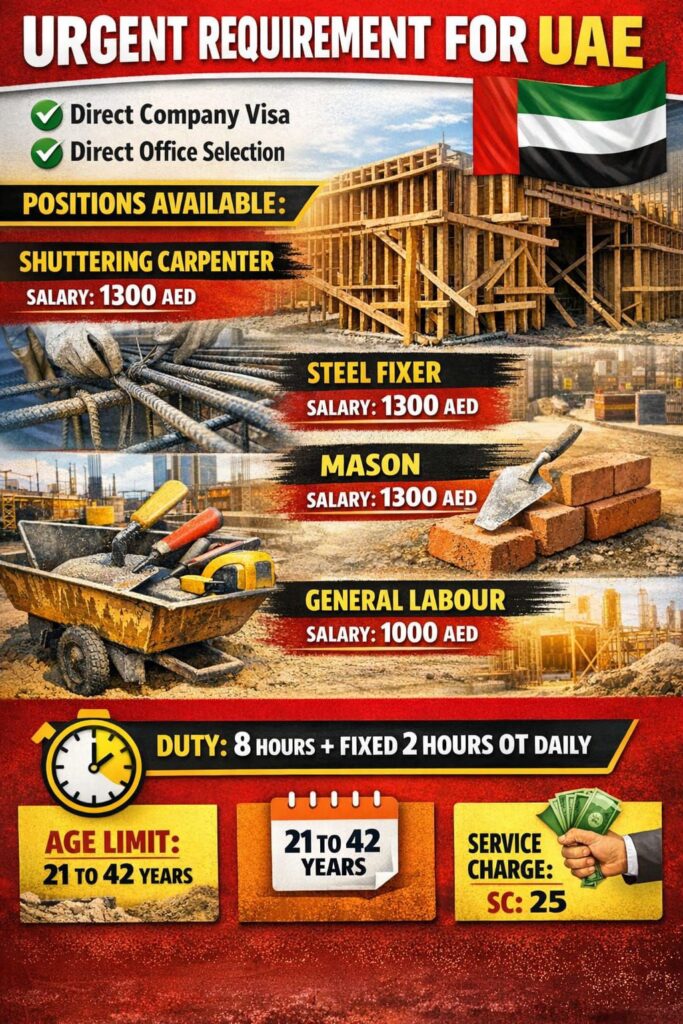 यह विज्ञापन संयुक्त अरब अमीरात (UAE) में निर्माण कार्य (Construction) के लिए भर्ती के बारे में है। यहाँ इसकी पूरी जानकारी हिंदी में दी गई है: