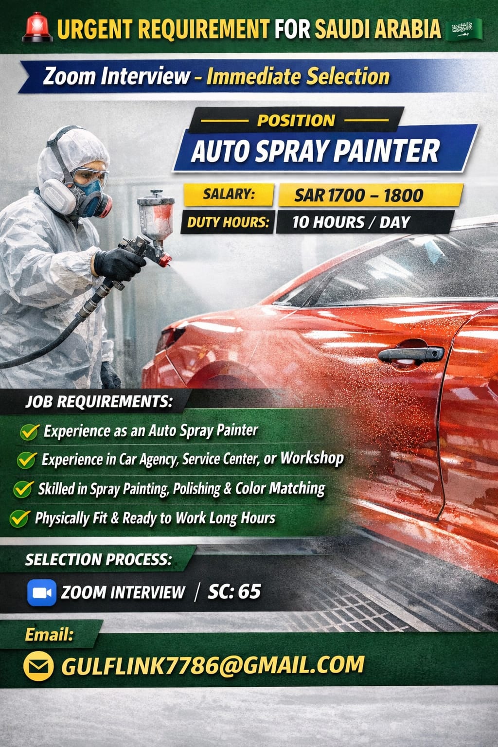 यह सऊदी अरब में Auto Spray Painter (कार पेंटर) की नौकरी के लिए एक भर्ती विज्ञापन (Job Advertisement) है। इसकी मुख्य जानकारी नीचे दी गई है: